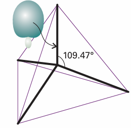 As a result of the interference between the component orbitals, each hybrid orbital consists of a large lobe pointing in the direction of one corner of a regular tetrahedron (Fig. 11.7). The angle between the axes of the hybrid orbitals is the tetrahedral angle, 109.47°. Because each hybrid is built from one s orbital and three p orbitals, it is called an sp3hybrid orbital. It is now easy to see how the valence-bond description of the CH4 molecule leads to a tetrahedral molecule containing four equivalent C-H bonds. Each hybrid orbital of the promoted C atom contains a single unpaired electron; an H1s electron can pair with each one, giving rise to a σ bond pointing in a tetrahedral direction. For example, the (un-normalized) wavefunction for the bond formed by the hybrid orbital h1 and the 1sA orbital (with wavefunction that we shall denote A) is