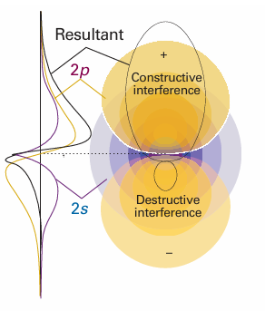 Because each sp3 hybrid orbital has the same composition, all four σ bonds are identical apart from their orientation in space (Fig. 11.8). A hybrid orbital has enhanced amplitude in the internuclear region, which arises from the constructive interference between the s orbital and the positive lobes of the p orbitals (Fig. 11.9). As a result, the bond strength is greater than for a bond formed