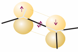 2s2 2p2x 2p1y 2p1z, with four unpaired electrons in separate orbitals. These electrons may pair with four electrons in orbitals provided by four other atoms (such as four H1s orbitals if the molecule is CH4), and hence form four σ bonds. Although energy was required to promote the electron, it is more than recovered by the promoted atom’s ability to form four bonds in place of the two bonds of the unpromoted atom. Promotion, and the formation of four bonds, is a characteristic feature of carbon because the promotion energy is quite small: the promoted electron leaves a doubly occupied 2s orbital and enters a vacant 2p orbital, hence significantly relieving the electron–electron repulsion it experiences in the former. However, we need to remember that promotion is not a ‘real’ process in which an atom somehow becomes excited and then forms bonds: it is a notional contribution to the overall energy change that occurs when bonds form. The description of the bonding in CH4 (and other alkanes) is still incomplete because it implies the presence of three σ bonds of one type (formed from H1s and C2p orbitals) and a fourth σ bond of a distinctly different character (formed from H1s and C2s). This problem is overcome by realizing that the electron density distribution in the promoted atom is equivalent to the electron density in which each electron occupies a hybrid orbital formed by interference between the C2s and C2p orbitals. The origin of the hybridization can be appreciated by thinking of the four atomic orbitals centred on a nucleus as waves that interfere destructively and constructively in different regions, and give rise to four new shapes. The specific linear combinations that give rise to four equivalent hybrid orbitals are