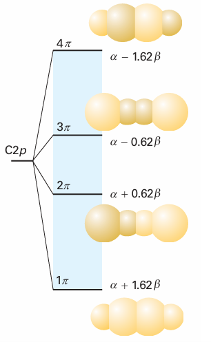 Fig. 11.39 The Hückel molecular orbital energy levels of butadiene and the top view of the corresponding π orbitals. The four p electrons (one supplied by each C) occupy the two lower π orbitals. Note that the orbitals are delocalized.