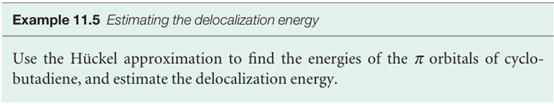 As we saw in the preceding example, the energies of the four LCAO-MOs for butadiene are , E=α±1.62β, α±0.62β , These orbitals and their energies are drawn in Fig. 11.39. Note that the greater the number of internuclear nodes, the higher the energy of the orbital. There are four electrons to accommodate, so the ground-state configuration is 1π2 2π2. The frontier orbitals of butadiene are the 2π orbital (the HOMO, which is largely bonding) and the 3πorbital (the LUMO, which is largely antibonding). ‘Largely’ bonding means that an orbital has both bonding and antibonding interactions between various neighbours, but the bonding effects dominate. ‘Largely antibonding’ indicates that the antibonding effects dominate.