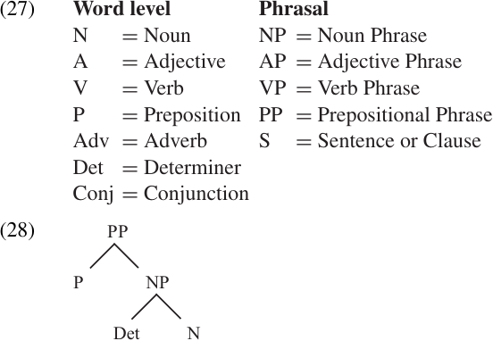 When tree diagrams are used to represent linguistic structure, the node labels provide two kinds of information about each unit: (i) its SYNTACTIC CATEGORY (e.g. Noun, Verb, etc.); and (ii) its “size,” or level in the grammatical hierarchy (word, phrase, clause, etc.). The list in (27) shows the category symbols that are generally used (we will introduce a few others later). A simple tree structure using these labels is given in (28). This tree represents a prepositional phrase which consists of two parts, a preposition followed by a noun phrase. The noun phrase, in turn, is composed of a determiner followed by a noun.
