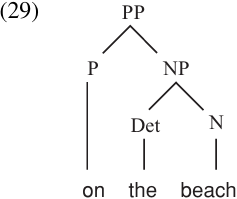 But, as far as we can tell from the tree in (28), this prepositional phrase contains no words. Obviously, we need a way to represent the actual words that make up the phrase, in addition specifying their part of speech. We will represent words as daughters of nodes which bear lexical (word-level) category labels, as shown in (29).