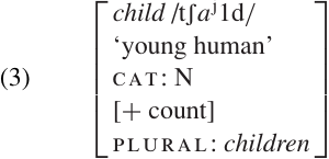 These differences in grammatical patterning can be used to separate the words that belong to the category Noun in to two sub-classes (or SUBCATEGORIES), count vs. mass nouns. Which sub-class a particular noun belongs to must be indicated in its lexical entry. In cases like this, where there is a simple two-way distinction to be made, linguists often think in terms of binary FEATURES.2 Features are used to represent a property that a given linguistic unit may or may not have. To distinguish between count vs. mass nouns, we could require the lexical entry of every noun to contain either the feature [+ count] (for count nouns) or [– count] (for mass nouns). Similarly, the subclass of AUXILIARY verbs, which have a number of special grammatical properties, could be distinguished from regular verbs by a feature [+ aux].