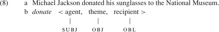It is important to notice that the valence of the verb (in this sense) is not the same as the number of arguments it takes. For example, the verb donate takes three semantic arguments, as illustrated in (8). However, donate has a valence of two because it takes only two term arguments, SUBJ and OBJ. With this predicate, the recipient is always expressed as an oblique argument.