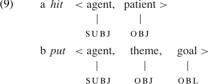To summarize, both valence and subcategorization tell us something about the number of arguments that must be expressed in a clause which contains a particular verb. However, there is an important difference between them. The valence of a verb tells us only the number of terms, or direct arguments; it says nothing about the presence or absence of oblique arguments. The subcategorization of a verb tells us all the Grammatical Relations which the verb assigns to its arguments, whether direct or oblique. So, for example, the verbs hit and put have the same valence (two), but different subcategorization sets, since put requires an oblique argument while hit does not, as shown in (9). (As a practice exercise, the reader should make up some example sentences to illustrate these argument structures.)