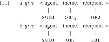 We have already seen that some verbs can be used in more than one way. In Semantic roles and Grammatical Relations, for example, we saw that the verb give occurs in two different clause patterns, as illustrated in (10). We can now see that these two uses of the verb involve the same semantic roles but a different assignment of Grammatical Relations, i.e. different sub categorization. This difference is represented in (11). The lexical entry for give must allow for both of these configurations.1