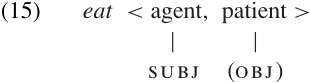 We might say that such verbs are semantically transitive, but differ from other transitive verbs in that they allow the patient argument to remain unexpressed. (For historical reasons, the pattern illustrated in (12b) and (13b) is sometimes called “unspecified object deletion.” A more precise term might be “unspecified patient suppression.”) We could represent the argument structure of these verbs as in (15), indicating that the patient may either be an OBJ, or be syntactically unexpressed: