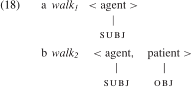 Thus, the variable transitivity in examples (16) and (17) seems to be of a different type from that in (12) and (13). For cases like (16) and (17), we might want to say that the verb simply has two different senses, each with its own argument structure (as illustrated in (18)), and both senses must be listed in the lexicon.