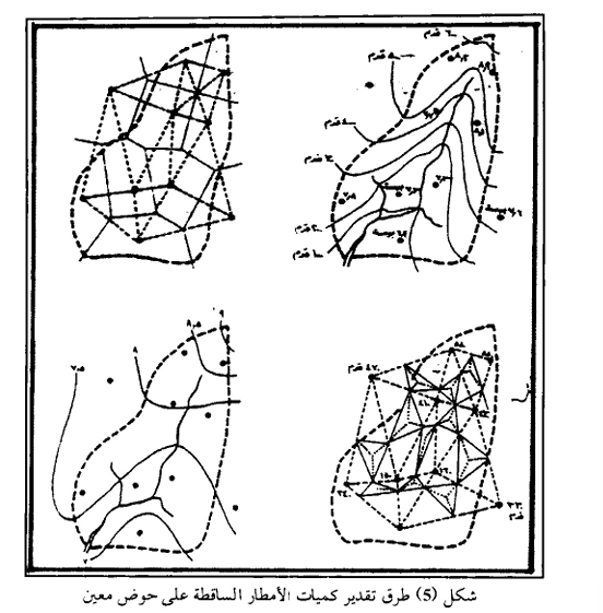 وبهذه الطريقة قسمنا الحوض إلى شكل مضلعات يقع بمنتصف كل ضلع محطة رصد للأمطار ثم نقوم بحساب نسبة مساحة كل مضلع من مسلحة الحوض الكلي، ثم نضرب معدل التساقط في كل محطة بنسبة المساحة ، ثم نجمع حاصل الضرب الذي يمثل متوسط كمية الأمطار على الحوض.