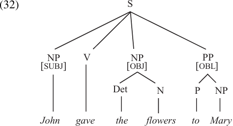The well-formedness conditions above speak of assigning Grammatical Relations to phrases which occur in particular Phrase Structure positions, specifically to clause-mates of V. But there is no indication in our Phrase Structure diagrams of which Grammatical Relation is assigned to which constituent, thus no way to be sure whether or not a particular tree structure satisfies the well-formedness conditions. It would be helpful to add this information to our PS trees in some way. The simplest approach is to add an ANNOTATION to the appropriate nodes in the tree structure, as in (32).