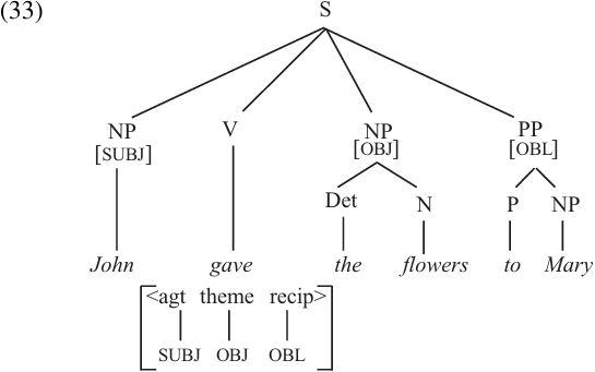 To see whether the well-formedness conditions are satisfied, we need to compare the subcategorization properties of the verb with the Grammatical Relations (GRs) assigned to its clause-mates. Although we normally write only a single word for each terminal element in our tree diagrams, this is just a short-hand notation which actually represents the full lexical entry. The rest of the information contained in the lexical entry, including (at least for verbs) the argument structure, is also assumed to be available. By making some of this information explicit in the tree diagram, as in (33), we can immediately check for completeness and coherence.