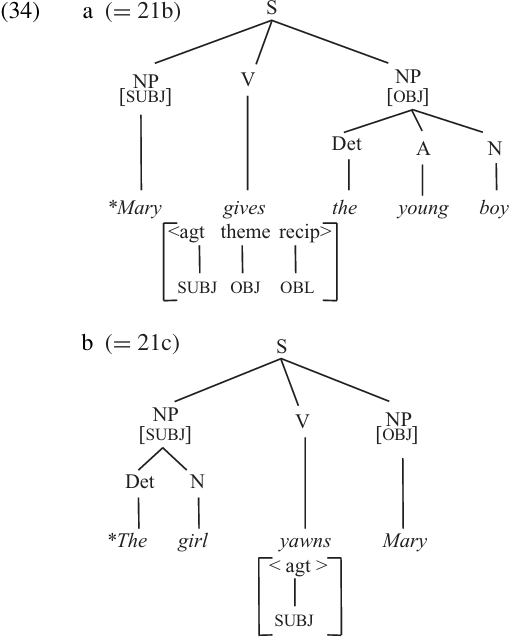 This kind of annotated tree diagram allows us to see at once what is wrong with the ungrammatical examples in (21) above: (21b) is incomplete, as demonstrated in (34a), while (21c) is incoherent, as demonstrated in (34b).