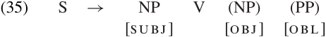 In a language like English, word order (or position in the Phrase Structure) is the most important signal for identifying the GR of a constituent: subjects normally come before the verb, direct objects immediately after the verb, etc. One way in which the grammar can specify the regular association of position with GR is by adding annotations to the PS rules themselves, as in (35). This rule will license tree structures like that shown in (33). The annotations can be thought of as extra units of information which must be true of the constituent that occupies a given position in the tree. The node labels for these constituents now specify not only syntactic category but also the GR which must be assigned.