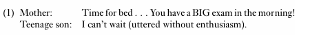 An expression is ironic when what is meant is the opposite of what is said. This is illustrated by the response of ‘Teenage son’ to his mother in example (1).