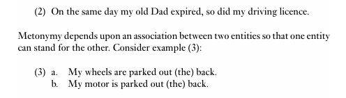 In this example, a salient component of a car, namely the wheels or the motor, can be used to refer to the car as a whole. This brief survey reveals that both ‘literal language’ and ‘non-literal (or figurative) language’ are complex concepts. We must therefore question the assumption that there are two distinct and discrete kinds of language use that can be unambiguously identified. In the next section, we focus in more detail on the question of whether literal and non-literal language are fully discrete.