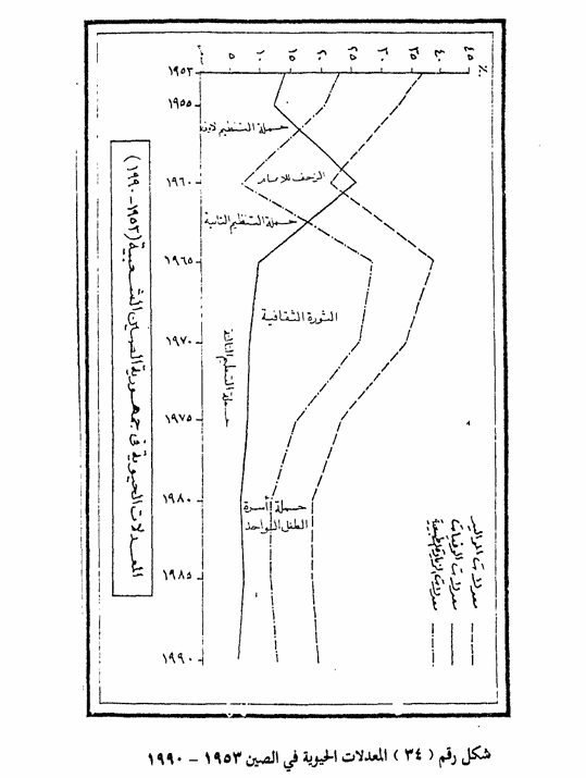 ويتضح من الجدول أن الاتجاه العام في كل من الحضر والريف هو انخفاض معدلات لمواليد، وبالتالي فإن المتوسط القومى فى الصين يتجه نحو الإنحفاض ، غير أنه يلاحظ أيضا أن المناطق الريفية أقل فى معدلاتها من المناطق الريفية ، ويظهر أثر غلبة الريف على نمط السكان في أن المتوسط القومي أكثر قربا من متوسط المعدلات في مناطق العمران الريفي ، فإذا أضفنا إلى ذلك أن الصين تحرص فى مناطق الأقليات العرقية على عدم تطبيق سياساتها الخاصة بتبني نمط الأسرة الصغيرة أو تطبيق أسلوب أسرة الطفل الواحد في مناطق الأقليات فإن هذا يعني أن ثمة تعددا في أنماط المواليد في أجزاء الصين المختلفة ولكم برغم ذلك ، فإن تفشي البطالة في الريف وفي مناطق الأقليات العرقية أيضا يؤدي في النهاية إلى أن تتقارب المناطق الريفية ومناطق الأقليات العرقية والتي تشمل ما بين 5 - 6 % من جملة سكان الصين مع المناطق الحضرية في الاتجاه إلى الأخذ بسياسة الدولة فى تبنى نمط الأسر الصغيرة ، ومن هنا نتوقع أن يكون الاتجاه نحو مزيد من انخفاض معدلات المواليد في الصين كما في شكل رقم ( 34 ) عن المعادلات الحيوية في الصين 1953 - 1990 ويظهر من متابعة المعدلات الحيوية فى الصين خلال الخمسين عاما الماضية أثر الأحداث الداخلية على المعدلات ، ويرتبط ذلك بكل من تطبيق مراحل السياسات السكانية أو الزحف الكبير للأمام.