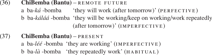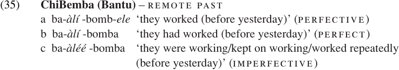 ChiBemba has three morphological aspect categories: perfect, perfective, and imperfective. However, a complete three-way contrast is possible only in some (not all) of the past tenses. Chung and Timberlake (1985:227–228), based on data from Givo̒n (1972), state that perfective is used for events which are completed, perfect for events which have enduring results, and imperfective for continuous or iterative events: