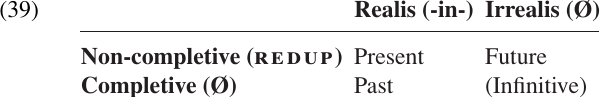 A number of authors have pointed out that this four-way contrast can be analyzed in terms of two fundamental distinctions.3 The infix-in- marks actions as having been begun, which corresponds nicely to the contrast between REALIS vs. IRREALIS TENSE. CV reduplication marks actions as being non-completed; verbs which lack this reduplication are in COMPLETIVE aspect, while the reduplicated forms are NON-COMPLETIVE.
