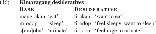 We cannot attempt a detailed survey of this topic here, but it will be helpful to give some examples of other modal categories found in various languages. One fairly common type of agent-oriented modality is the DESIDERATIVE, which expresses a desire rather than an actual event. The following examples are from Kimaragang Dusun, a language of East Malaysia.