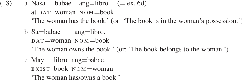 As the Tagalog example (6d) shows, possession is one of the relationships which can be expressed by the locative (i.e. prepositional) clause type. But the possessive relation involved in that example is of a particular kind: temporary physical possession, rather than ownership. The sentence tells us where the book is, rather than whom it belongs to; thus, the use of the locative clause pattern seems quite appropriate.
