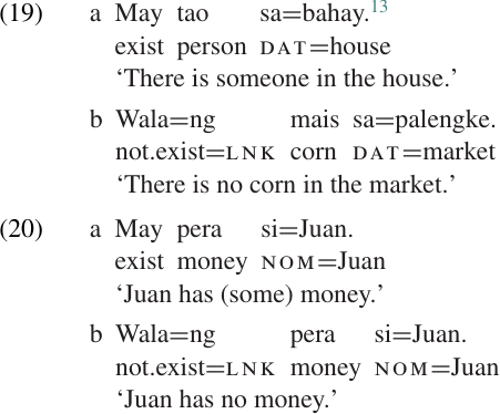 Compare the indefinite possessive example (18c) with the EXISTENTIAL CLAUSE in (19a). As you can see, both sentences contain the same existential predicate (may) followed by a bare NP, i.e. an NP with no case marker.12 (19b) is another example of an existential clause, but it contains a different existential predicate: in place of may, which expresses positive existence (something does exist), (19b) has wala̒, which expresses negative existence (something does not exist). These same two existential predicates can also be used to express positive and negative possession, respectively, as illustrated in (20).