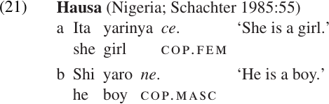 Up to now we have used the terms COPULA and LINKING VERB interchangeably. However, some languages have a copula which is not a verb. In Hausa, for example, verbs normally occur in the middle of a clause; the basic word order is S–Aux–V–O, with the auxiliary element indicating person, number, gender, and tense/aspect. The copula that appears in equative clauses, however, appears in final position and is inflected only for gender, as illustrated in (21). It does not fit well within either the category V or the category Aux.
