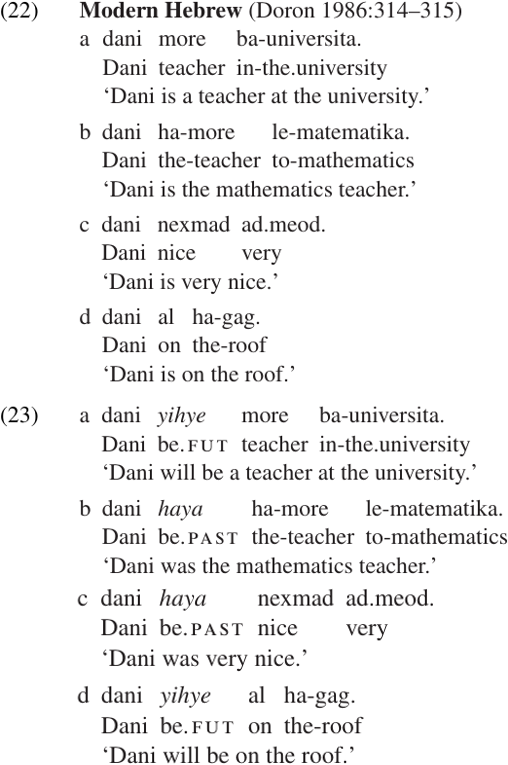 A number of languages have verbal copulae which are only used in non-present tenses. In Modern Hebrew, for example, attributive, equative, and locative clauses in the present tense do not contain any copula, as illustrated in (22), although they may optionally contain a nominative pronoun that doubles the subject NP (not shown here). In past or future tenses, however, an inflected copular verb (root: h.y.y) is obligatory, as illustrated in (23).