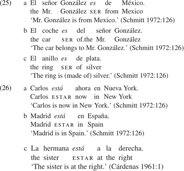 When the predicate complement is a prepositional phrase, ser is used with the preposition de ‘of, from’ in all its various senses; while estar is used with the prepositions en ‘in, on’ and a ‘at.’ Some examples are provided in (25–26).
