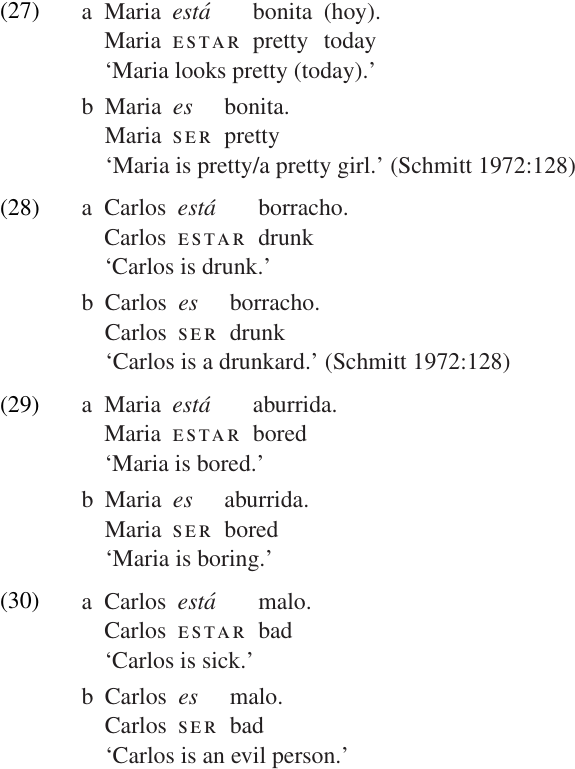 Notice that the choice of copula in locative clauses depends only on the specific preposition used; estar is used with the preposition en whether the location is understood as being temporary (26a) or permanent (26b). When the predicate complement is an adjective phrase, however, either copula may be used. The choice is made on semantic grounds: ser is used to express inherent properties or characteristics; while estar is used to express temporary states. This contrast is illustrated in (27–28). Some adjectives can take on two different meanings depending on which copula is used, as illustrated in (29–30).