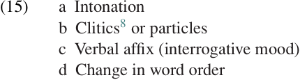 Since Yes–No questions do not contain a question word, there must be some other means of distinguishing them from simple declarative sentences. The most commonly used devices for marking Yes–No questions are listed, in descending order of frequency, in (15):
