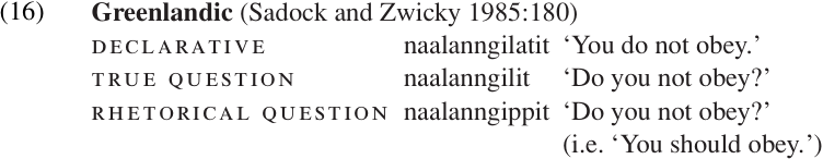 The marking of interrogative mood by an inflectional affix on the verb seems to be much less common than the use of a clitic or particle. An interesting example of a language which does have interrogative mood affixation is Greenlandic, which actually has two different interrogative forms, one for true questions and another for rhetorical questions: