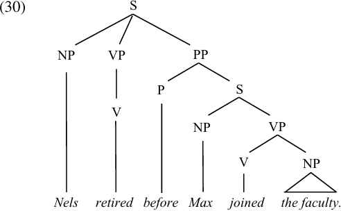 These prepositions are sometimes referred to as “subordinating conjunctions” when they are used to introduce adverbial clauses. Some linguists prefer to analyze them as complementizers in this context, and to assign the adverbial clauses which they introduce to the category S՛. However, in view of the parallelism illustrated in (28–29), we will treat them as prepositions and assign the adverbial clause to the category PP, as illustrated in (30). This analysis requires us to modify our PS rules for English slightly, to allow prepositions to take objects which belong to one of two categories, NP or S.