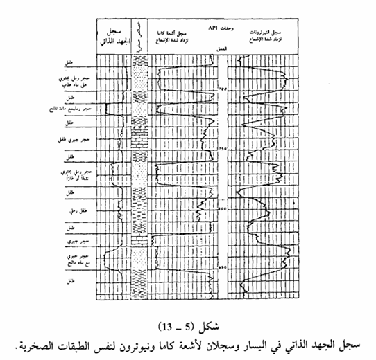إن مبدأ عمل سجل الجهد الذاتي Self Potential Spontaneous Potential or يستند إلى قياس فرق الجهد بين قطب كهربائي في السطح وقطب كهربائي في داخل البئر، وفي أثناء التسجيل يتم سحب القطب الكهربائي داخل البئر من الأسفل إلى الأعلى وتنشأ فولتية كهربائية ذاتية بسيطة داخل البئر في مناطق سطوح الاتصالات بين الطبقات المنفذة (Permeable) من الوحدات الصخرية كالحجر الرملي والحجر الجيري مثلاً وبين الصخور الأقل نفاذية كالطفل (Shale)، كما أن هناك عاملاً آخر يساهم في تكوين فولتية كهربائية داخل البئر هو الفرق بين درجة ملوحة المياه الموجودة في الطبقات الصخرية وملوحة ماء أو طين الحفر. أما سجل الجهد الذاتي ((Log لاحظ الشكل (5 ـ 13)، فيكون شاقولياً (قراءته صفر) أمام الطبقات الطينية في البئر ويسمى ذلك الخط خط الطفلline Shale يكون شاقولياً أيضاً حينما تكون ملوحة طين الحفر مساوية لملوحة مياه الطبقات. أما شكل منحني الجهد الذاتي أمام الطبقات المنفذة التي تحوي على مياه ذات ملوحة أعلى من ملوحة طين الحفر فإنه ينحرف إلى اليسار وينحرف المنحني إلى اليمين أمام الطبقات التي تحوي مياهاً عذبة (أي ذات ملوحة أقل من ملوحة طين الحفر).