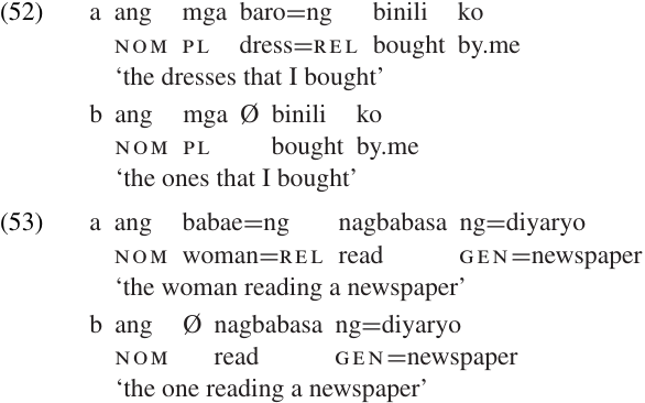 NPs like the (b) examples are referred to as HEADLESS RELATIVE CLAUSES. They take the normal NP markers (case, determiners, etc.) and contain a modifying clause, which may be preceded by a relative pronoun or relativizer if these are present in normal relative clauses; but they lack a head noun. Notice that the English translations of these examples include a pronominal element one as head of the NP, since English does not allow true headless relative clauses. The interpretation of a headless relative clause will depend on context; the ones that I bought could refer to dresses, fish, bicycles, shares of stock, etc., depending on the previous discourse. But quite often headless relatives are used to refer to people; so (53b) could be translated the person reading a newspaper.