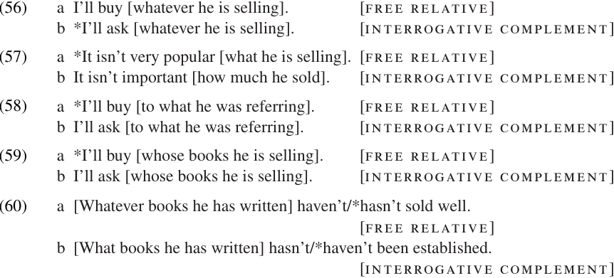 Several grammatical differences between these two constructions are noted by Bresnan and Grimshaw (1978); and McCawley (1988).1 Only in free relatives can the question word end with–ever (56). Only interrogative complements can be extraposed (57). Only in interrogative complements can the Wh-phrase contain a preposition (58) or a possessor (59). And only free relatives can trigger plural number agreement (60).