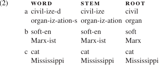 A root or stem is called BOUND if it cannot occur on its own without additional affixation; a FREE form is one that can occur as an independent word. In English, because there is relatively little inflectional morphology, most roots and stems are free, as illustrated in (2). Some examples which could be analyzed as bound roots are presented in (3).