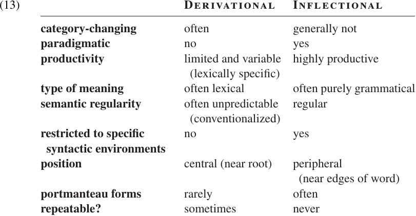 b Derivational morphology tends to have “lexical” semantic content, i.e. meanings similar to the meanings of independent words (X-er: ‘person who Xes’; X-able: ‘able to be Xed’; etc.). Inflectional morphology, on the other hand, often has purely grammatical meaning (plural number, past tense, etc.).