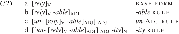 20. Since un- is the only prefix in this form, it may not be obvious that it needs to be attached at any particular stage of the derivation. However, we know that it cannot attach to nouns, so it cannot be added after-ity; there is no such verb as unrely; therefore, the only possible base in this example is the adjective reliable, as indicated in (32c). The change from–able to–abil when–ity is added is an example of ALLOMORPHY, which will be discussed in Allomorphy.