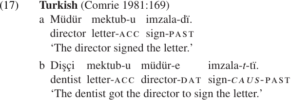 We presented some Turkish examples involving CAUSATIVE verbs. One of these is repeated in(17b).