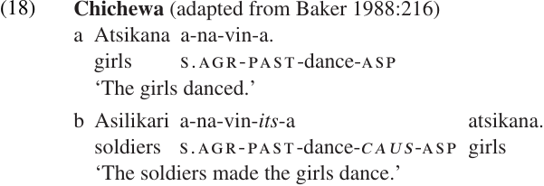 Causatives always introduce a new participant, the causer, which is normally the subject of the derived verb.7 If the base verb is in transitive, as in the Chichewa example (18), then the derived causative will be transitive. So causative formation is a valence-increasing process.