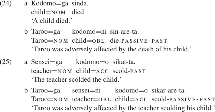Adversatives are sometimes described as being special type of passive construction.9 Some languages, including Japanese, use the same affix for both the passive and the adversative. Compare the adversatives in (24b) and (25b) with the normal passive in (3b) above.10
