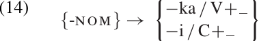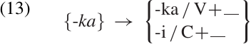 In this rule, one allomorph is chosen as the basic form or label for the morpheme. This form is shown in braces {xx} on the left side of the rule, with the phonemic form of each specific allomorph listed on the right side. The “+” in the environment on the right side indicates a morpheme boundary. The rule in (13) can be interpreted as follows: “the suffix {-ka} is realized as /-i/ when it attaches to a stem ending in a consonant, but as /-ka/ when it attaches to a stem ending in a vowel.”