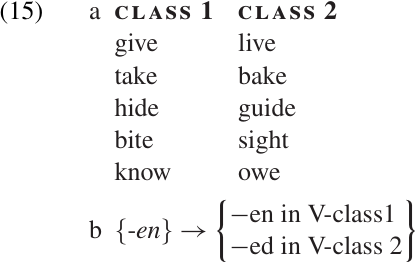As an example of lexically conditioned affix suppletion, let us return to the English past participle suffixes illustrated in (3). We will refer to the set of verbs that take the–en allomorph as “class 1” and the set of verbs that take the–ed allomorph as “class 2.” (For simplicity, let us assume that these two classes are all that we need to deal with.) The lexical entry for each verb in English will have to contain a feature showing which class it belongs to. The rule of allomorphy specifies which allomorph will be chosen based on which of these features is found in the lexical entry. A simple way of writing such a rule is shown in (15b).