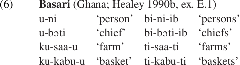 A CIRCUMFIX is a discontinuous affix, with elements added both before and after the stem, as illustrated from Malay in (2) and Basari in (6). Nouns in Basari carry markers that indicate their noun class and number (singular vs. plural). Some of these markers are circumfixes:
