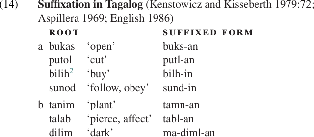 The term METATHESIS refers to the reversal of two elements: xy → yx. PHONOLOGICAL METATHESIS, i.e. a morphophonemic process that reverses the order of two phonemes in a particular phonological context, is not too unusual. For example, some roots in Tagalog lose the vowel of their final syllable when a suffix is added, as illustrated in(14a). If this vowel deletion creates a consonant cluster in which a labial follows a dental/alveolar, as in(14b), the order of the consonants in the cluster is reversed. This kind of metathesis can be viewed as a “repair strategy” which a language may use to deal with impermissible clusters or other syllable patterns which are not allowed in that language.