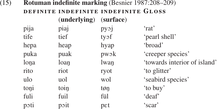 Cases of MORPHOLOGICAL METATHESIS, i.e. cases in which the metathesis itself is used as the marker for a particular grammatical feature, are much harder to find. One of the most famous examples is the Malayo-Polynesian language Rotuman, spoken east of Fiji. The basic syllable pattern in Rotuman is (C) V, so most words end with a vowel in their basic or “citation” form. This is also the form that would be used in a noun phrase that refers to a definite, specific entity. When a noun phrase is used within definite or non-specific reference, the last word in the NP is marked by reversing the order of the final vowel and consonant. The resulting CVVC sequence is then “squeezed” down into a single C(C)VC syllable by various phonological processes such as glide formation, vowel coalescence, etc. Some of these processes are illustrated in (15). (Notice that many of the words in this list are not nouns. This is because indefiniteness is marked only on the last word of the NP, which is not necessarily the head noun. In relative clauses, for example, the modifying clause follows the head noun, so the last word of the phrase could belong to virtually any category.) The key point here is that the metathesis is triggered by a syntactic (or perhaps pragmatic) feature, [-definite], rather than a specific phonological context. Such examples are quite rare.