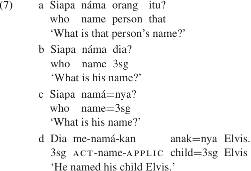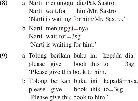 Indonesian has two different kinds of personal pronouns, bound (i.e. clitic) and free. For simplicity, we will focus on the third person singular forms: the free pronoun dia and the enclitic=nya. The fact that=nya is phonologically bound to its host can be demonstrated by stress placement. Cohn (1989) states that primary stress in Standard Indonesian always occurs on the next-to-last syllable of the phonological word. This makes it easy to identify phonological word boundaries, since wherever we find a syllable that bears primary stress, we know that the next syllable must occur at the end of a phonological word. As Cohen demonstrates, primary stress must shift one syllable to the right when either a suffix (7d) or an enclitic (7c) is added.