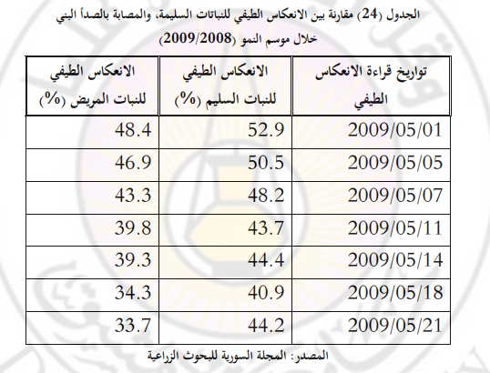 يبين الجدول (24) سبع قراءات متكررة للنباتات تظهر الاختلاف في القيم الانعكاسية في المجال تحت الأحمر القريب من 0,790 إلى 0,810 ميكرومتر.
