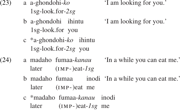 So, while the subject-marking prefixes in Muna have the properties we expect of agreement affixes, the object markers seem more like clitic pronouns. A very similar pattern is reported in the Bantu language Chichewa (Bresnan and Mchombo 1987).
